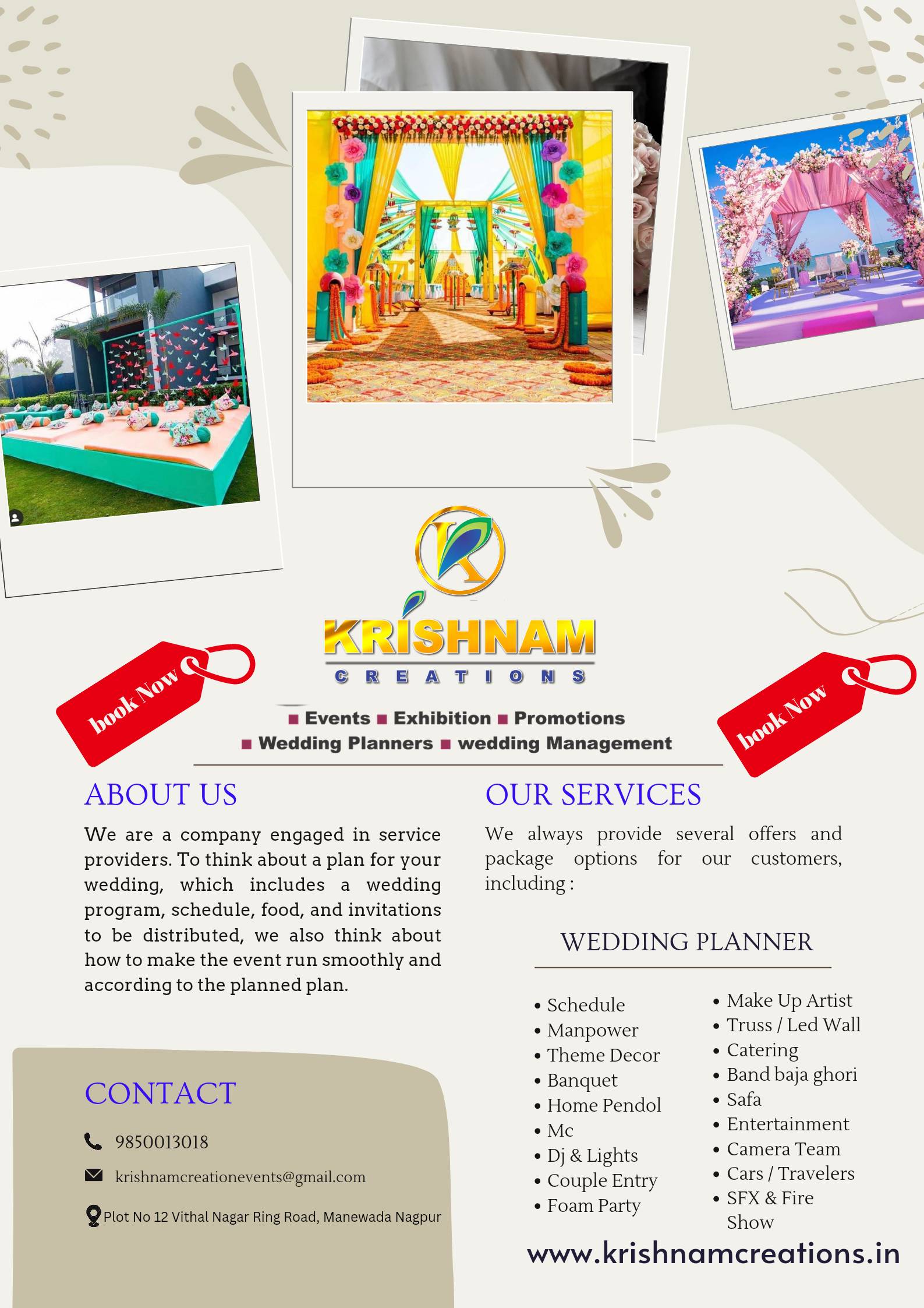 Book your Upcoming Events With Us Krishnam Decorators & Event Management *www.krishnamcreations.in* *www.krishnamevents.com* Krishnam Creation Events & Wedding Management Contact no :- *9850013018* , *8767626473.*